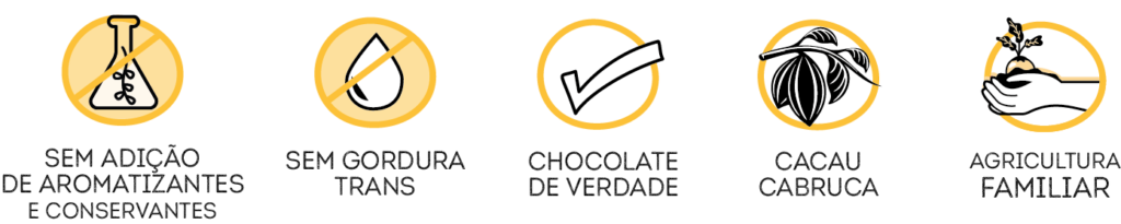 Chocolate artesanal, com sabor e aroma marcantes da fermentação do cacau – sabor forte do liquor/nibs do cacau. Equílibrio perfeito entre dulçor e amargor do cacau.