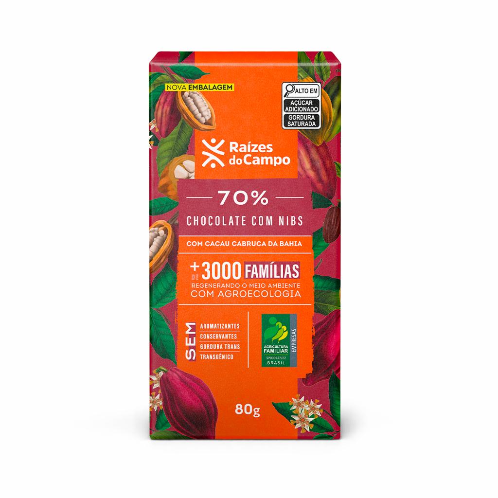 - Chocolate 70% Cacau com Nibs: rústico e encorpado, com pedaços de nibs que realçam o sabor e trazem crocância.